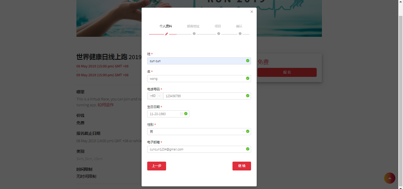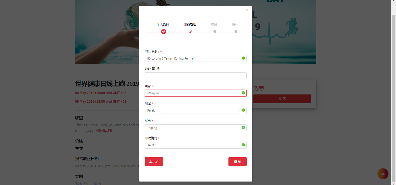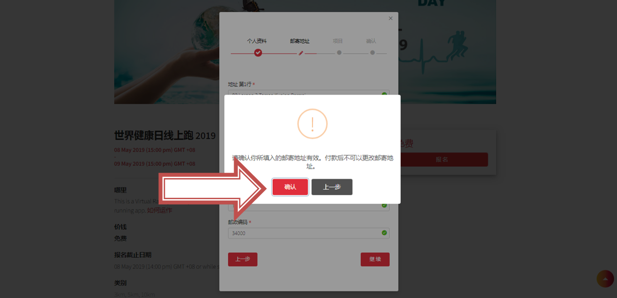 3. 填入您的寄送地址。 如果您想更改寄送地址请在赛事开始的10天之前通知我们。