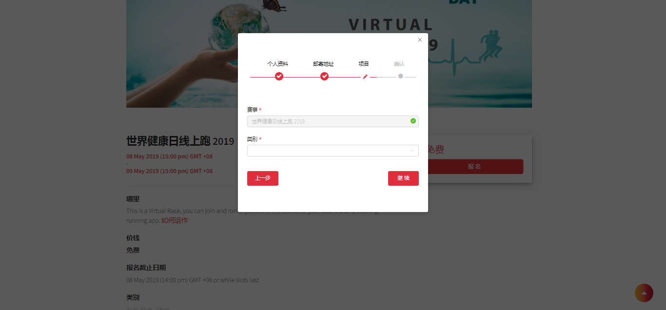 5. 选择您想要参加的里程。如果那赛事有T-shirt或其他商品那您可以选择加购。